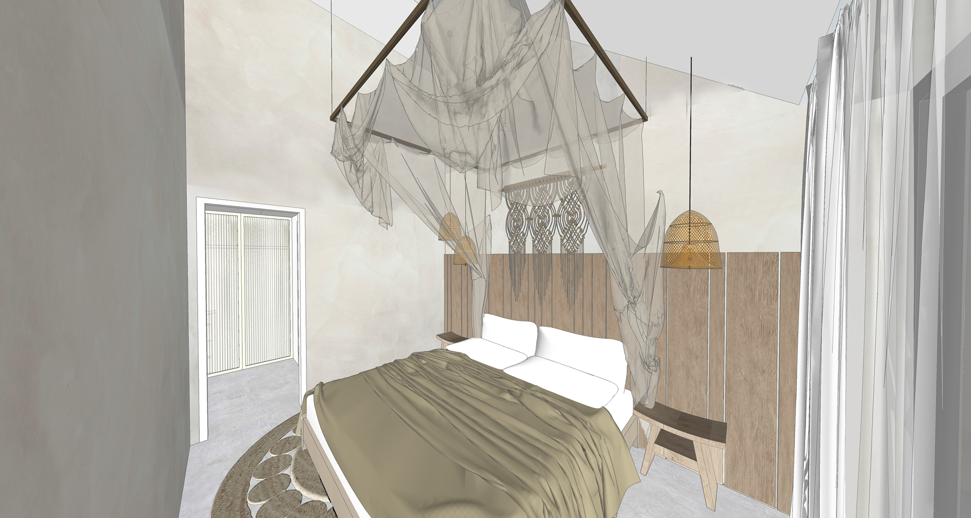 Díky všudypřítomné zeleni a soukromé zahradě bude bydlení klidné a svou barevností se bude přelévat exteriér do interiéru. Středobodem dne bude zahrada s koupacím bio jezírkem a prokojení přzemí s terasou a zahradou celkově. To znamená základ barevné palety bude v teplých, zemitých tónech se sem tam jemným „pop of colour” v olivové barvě. Celkově minimalistický vzhled, který ctí princip „méně je více” a nese prvky sofistikovaného designu s kvalitními výrobky. Důležité jsou struktury (vizuálně i na dotek) a wabi-sabi filozofie, která uznává přirozený životní cyklus materiálů a předmětů v domácnosti a přijímá jejich nevyhnutelné stárnutí, které je ale například u dřeva krásné a jedinečné.