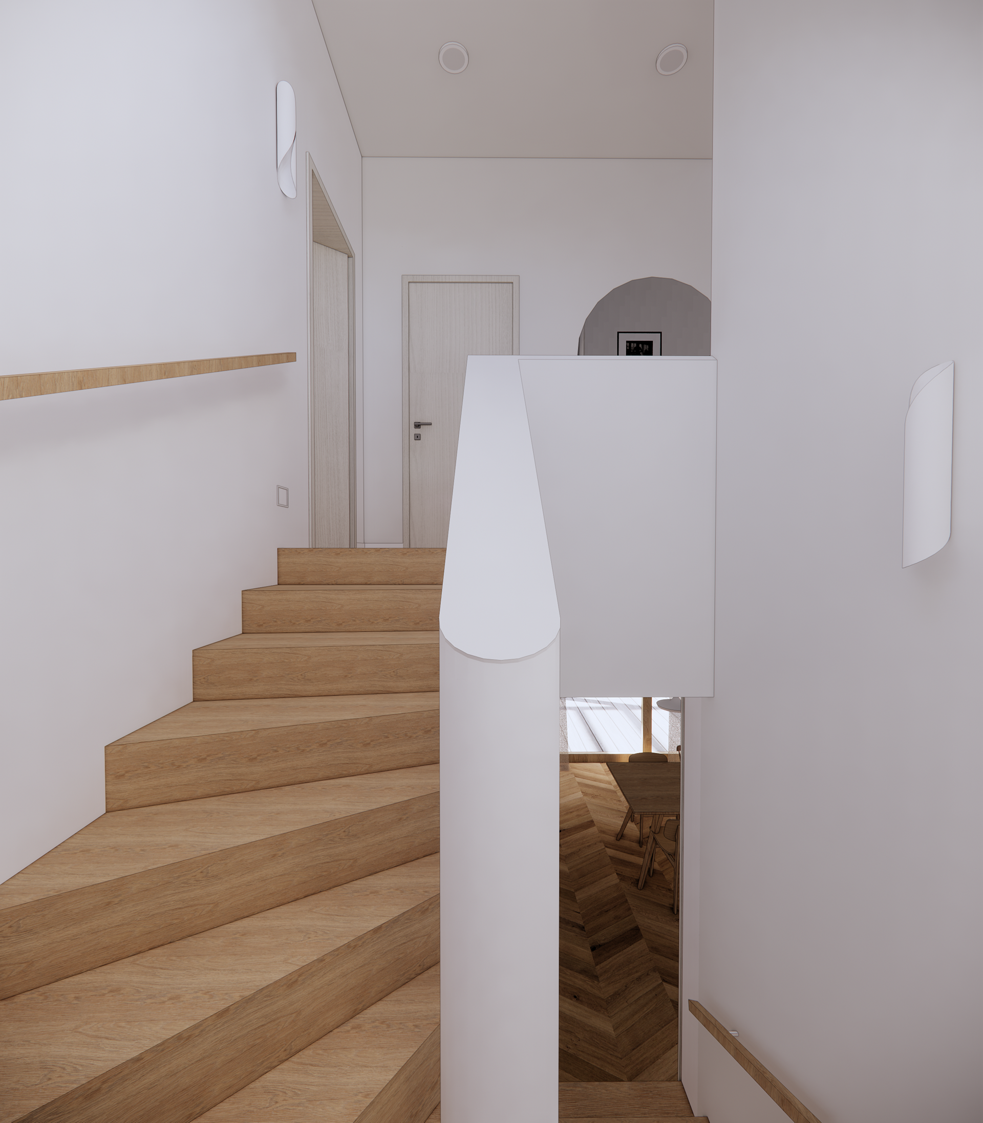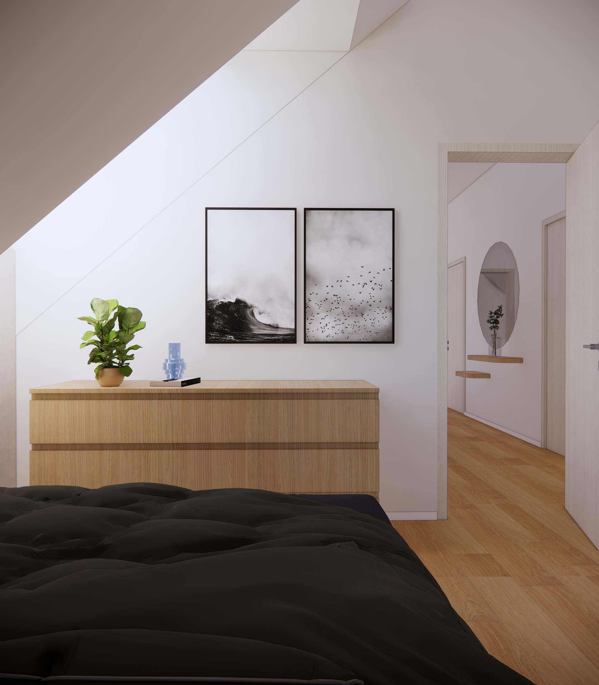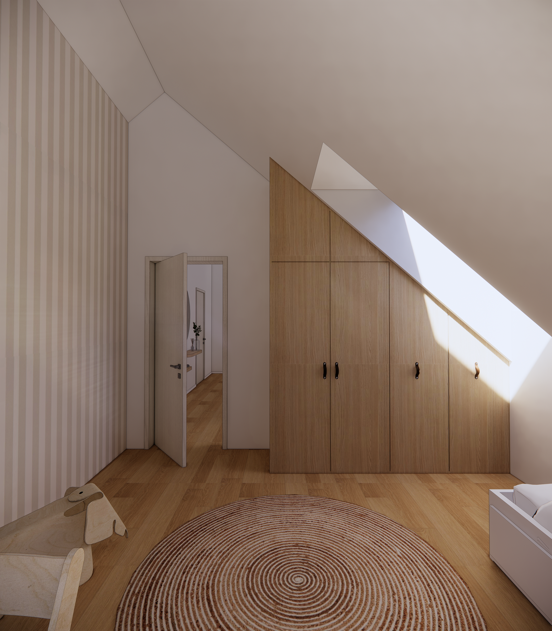 Veškeré místnosti mají k dispozici vytipovaná místa pro umístění vestavného nábytku a dostatek denního světla díky stropním oknům. Útulnost zajišťují podobné materiály a barevnost, jaká se objevuje v přízemí a prochází tak celým domem.