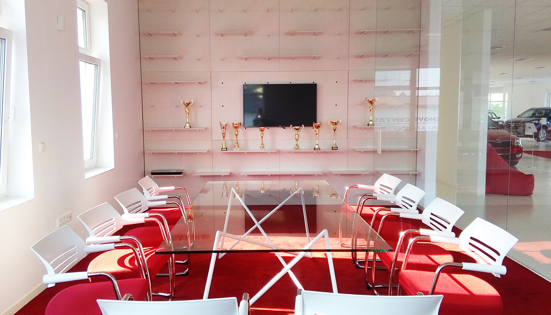 Na začátku byla vize přestavět autosalon se standardními vozy na výstavní showroom. Základní barevný koncept autosalonu vychází z klientovy oblíbené italské trikolóry, která je i součástí vizuální identity formulové stáje Effective. Bílý prostor dává vyniknout vystaveným automobilům a zároveň odráží denní světlo hluboko dovnitř budovy. Tekuté tvary rudých linií jsou inspirovány pohybem a designem automobilů a zelenou zastupují živé květiny, které zároveň zlepšují interiérové klima. Původní dispozice byla zvětšena a sladěna v jeden celek včetně prosklení jednací místnosti a zaoblená příčka kryje provozní zázemí. EFFECTIVE CARS SHOWROOM, ROUDNICE NAD LABEM / KLIENT: Effective cars s.r.o. / VELIKOST: 750 m2