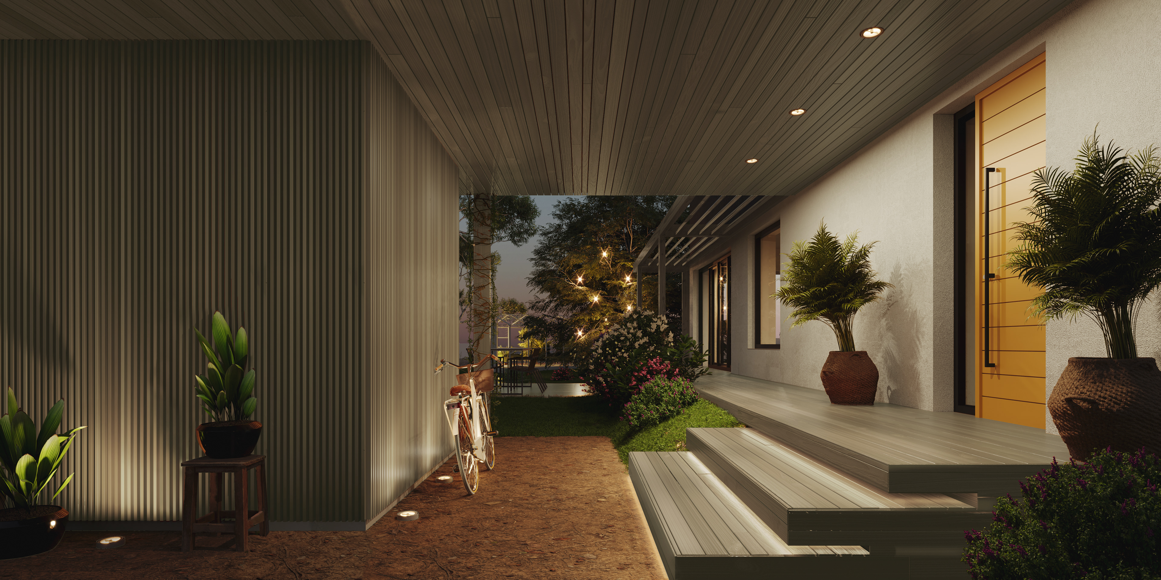 Pro jednotlivé přístavby byl zvolen dřevěný obklad, který přináší blízkému okolí zjemnění, možnost kontaktu s přírodním materiálem a přirozené barevné stárnutí, které příjemně koresponduje se zahradní zelení. Přízemní patro samotného domu je navrženo v bílé fasádní omítce, která podpoří odraz světla směrem do interiéru - jedná se o stávající hmotu. Hlavní optickou proměnou domu je přidání horizontálních přístaveb potlačujících celkovou výšku stavby. Pro zvýšení efektu usazení domu k zemi je část nad slunolamy včetně vikýřů navržena v tmavě šedém odstínu.