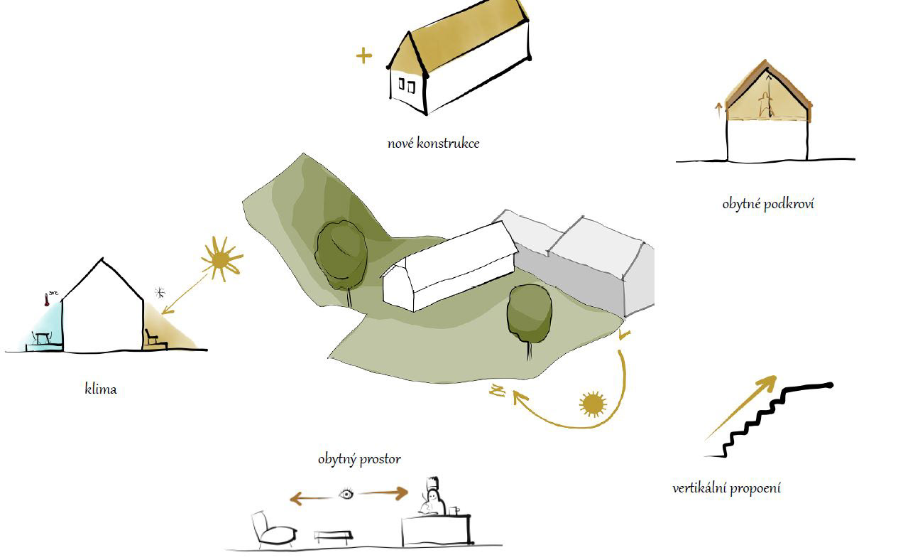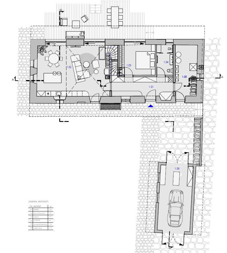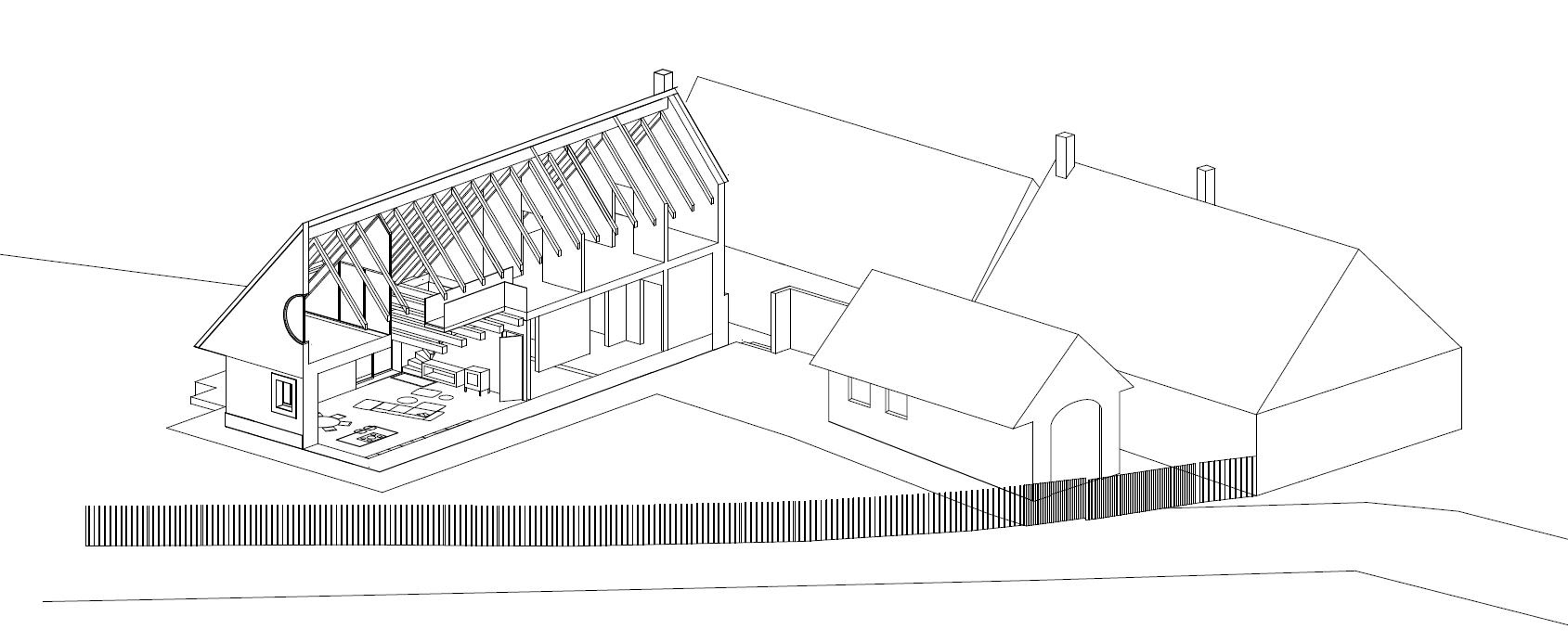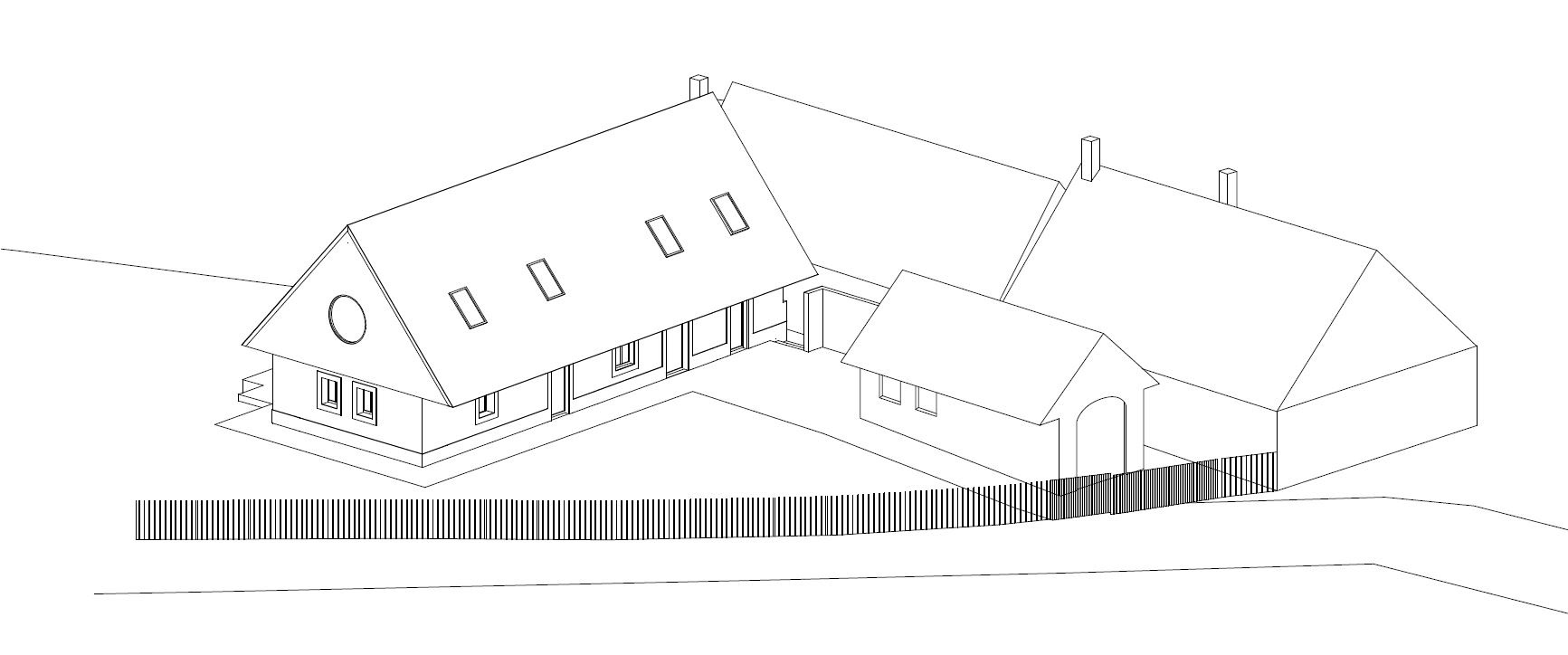Pátečním pozdním odpolednem začíná typický víkend. Příjezd bránou kolem vysokého ořešáku, zaparkování auta do garáže, průchod kolem rozkvetlého záhonu, vstup do domu. Zádveří tu nehledejte, vchází se přímo do chodby, jako kdysi. Na lavici odložíme víkendová zavazadla, abychom se mohli pohodlně zout. Z chodby vcházíme přímo do hlavního obytného prostoru, který zaujímá strategické místo s výhledy do tří stran a je otevřený až do krovu. Ale dnes už je večer. Ke spokojenosti nám postačí krbová kamna, teplo a dobrá večeře. A když na nás dolehne únava, ložnice i koupelna jsou hned vedle.