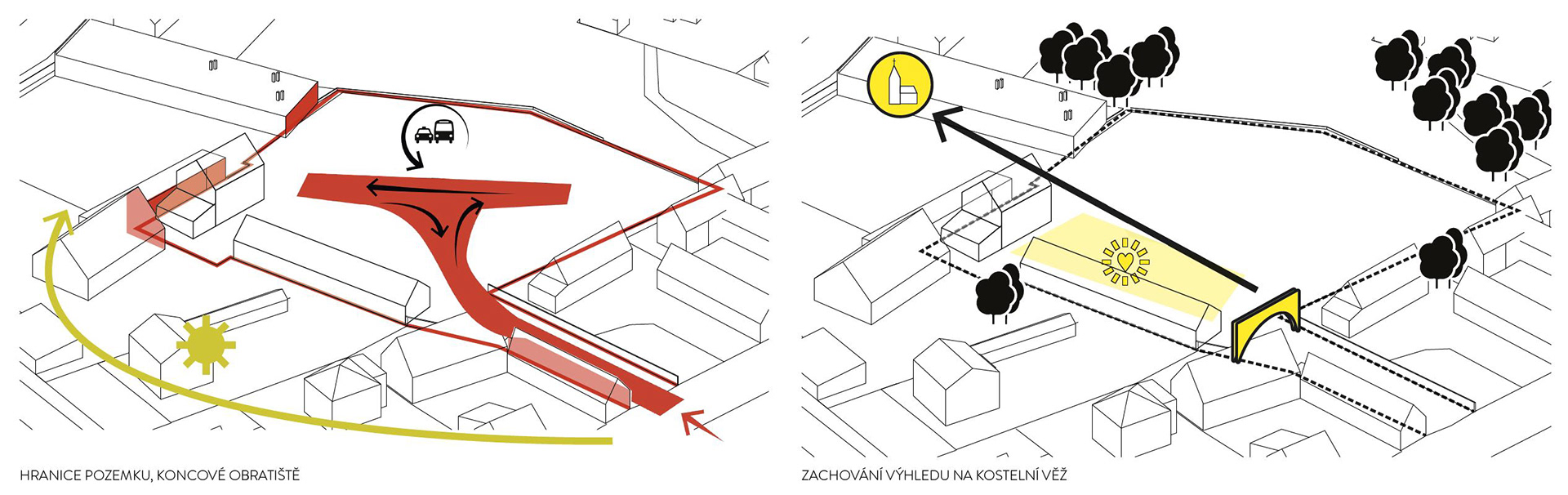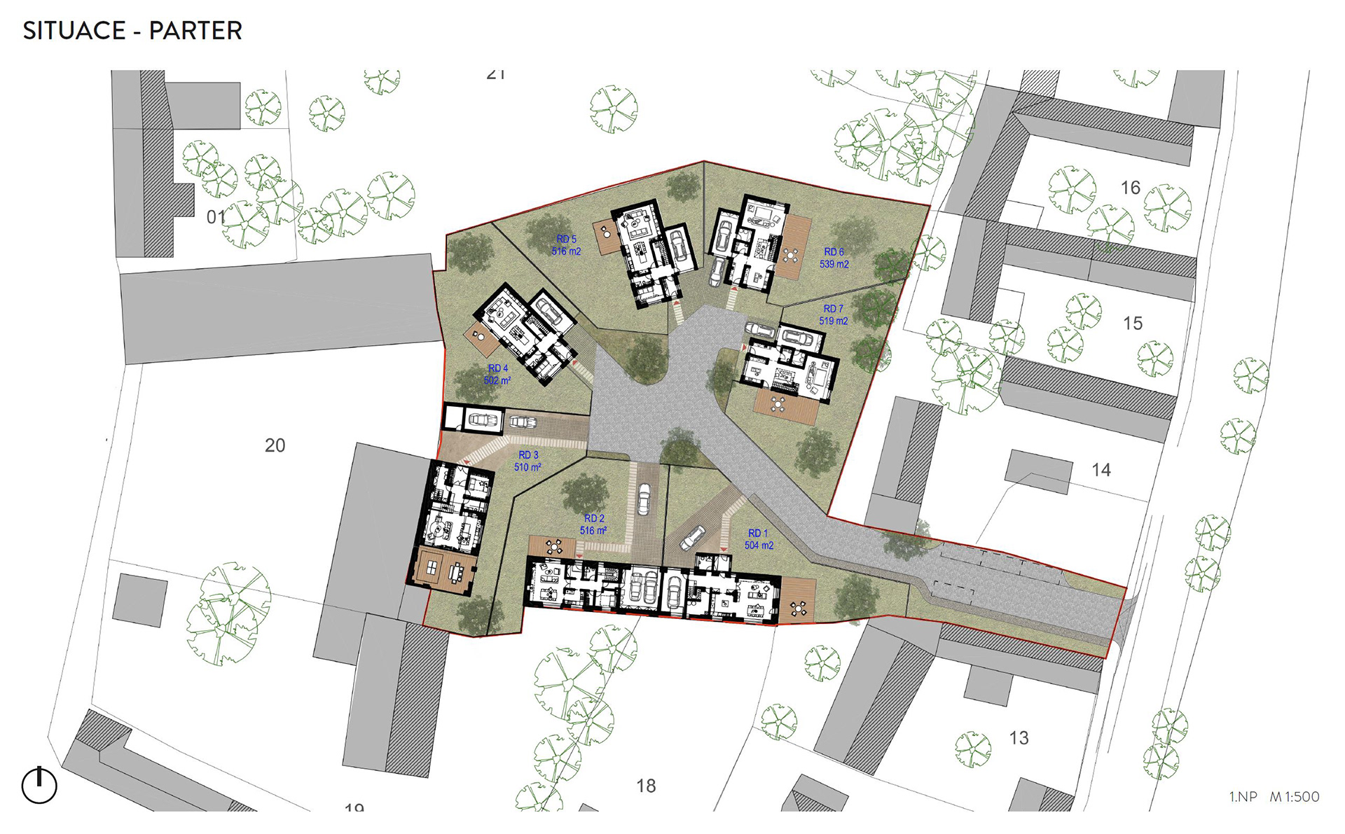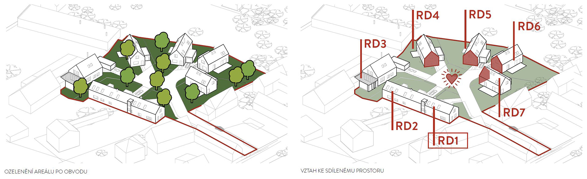 Nově definovaný společný dvůr bude konturován štíty novostaveb navazující na sdílený prostor zatímco soukromé terasy mají výhledy do klidných zahrad. Tvarosloví domů navazuje sedlovými střechami na ráz obce, přičemž je zachován průhled na kostelní věž.