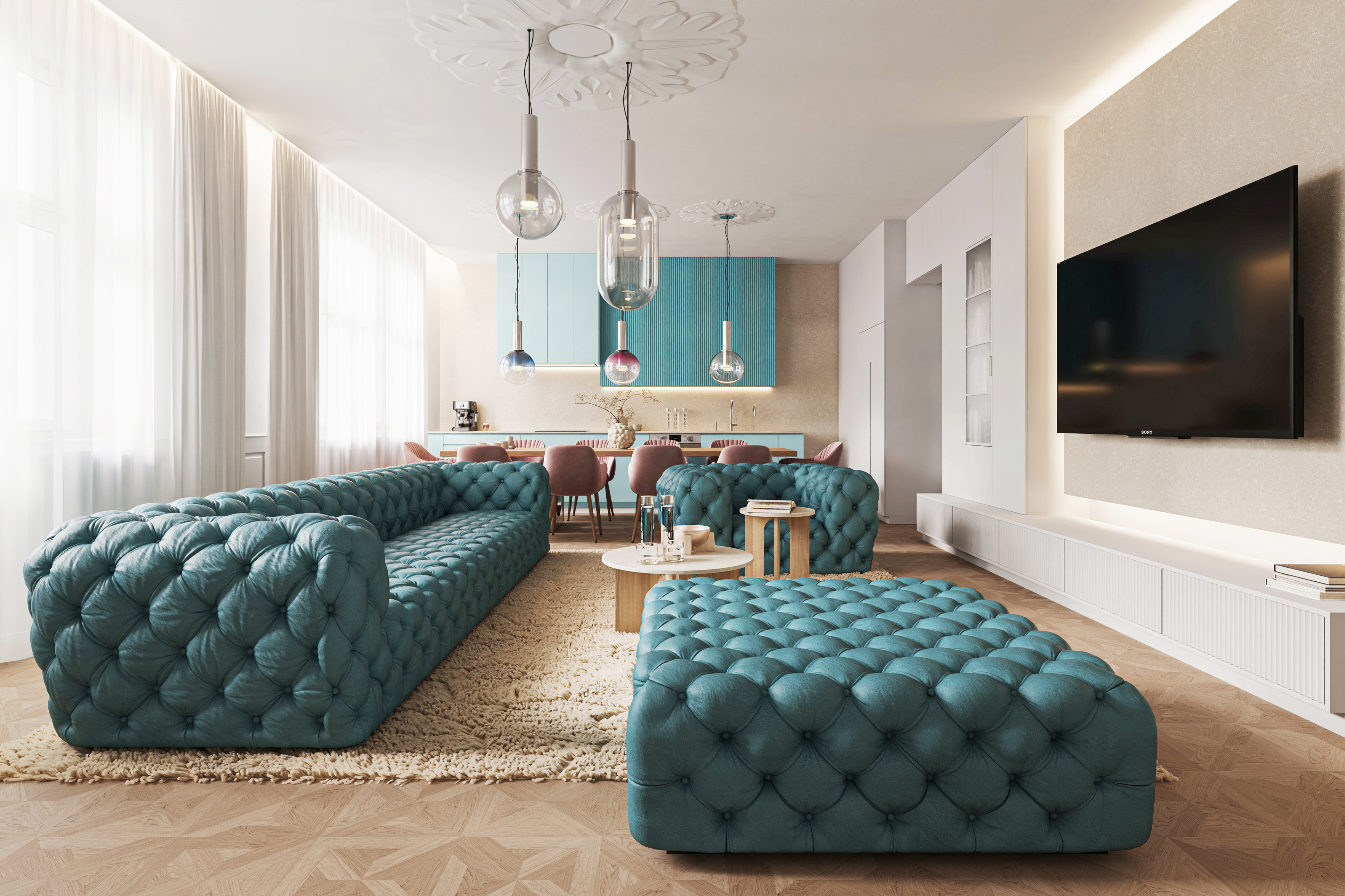 Středobodem domova je obytný prostor, kde se rodina schází, tráví společné chvíle a zároveň nachází klid pro odpočinek a relaxaci. Propojením místností vzniká vzdušný prostor, který kombinuje teplé tóny dřeva, svěží pastelové akcenty a čisté bílé plochy, což interiéru dodává moderní, ale útulnou atmosféru. Výrazným prvkem je pohodlná sedací souprava, doplněná o úložné řešení na míru. Posuvné dveře umožňují variabilitu využití prostoru a zároveň zajišťují dostatek přirozeného světla do centrální chodby v hloubi dispozice. Velký důraz byl kladen na rozvržení doplňkového ambientního a pomocného osvětlení tak, aby byt sloužil od rána do večera.
