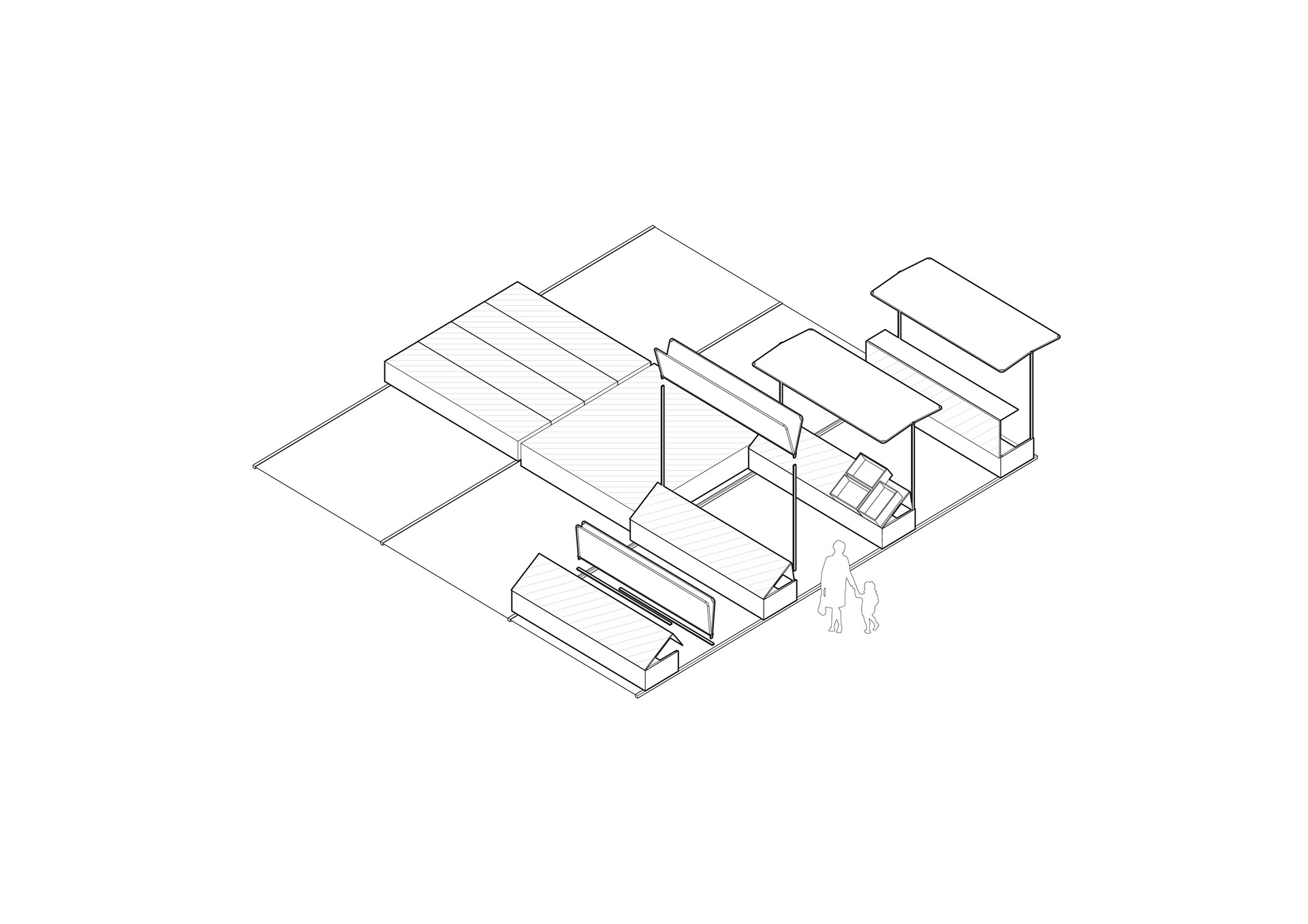 Navrhujeme pět elementů mobiliáře, které jsou v našem pojetí racionálním nástrojem pro uskutečnění zvolené strategie, urbanistického záměru, nebo architektonické ambice, která je vždy reakcí na kontext průmyslového města. Rušíme současnou neuchopitelnost, nevyužitelné travnaté plochy i banální mobiliář. Očišťujeme prostor, odstraňujeme bariéry, srovnáváme a modelujeme jeho sjednocený povrch. Abstraktní geometrii kolejnic vnímáme jako osnovu, která ovládá celý prostor a určuje pravidla. Nechceme fyzicky přerušit návaznost na plánovanou stanici rychlovlaku, či možné obnovené autobusové nádraží. Zároveň cítíme potřebu odlišit silnici a veřejný prostor určený pěšímu pohybu. Mezi komunikací a náměstím je navržen pás 5ti listnatých stromů nižšího vzrůstu, které tvoří prostupnou pohledovou bariérou před výhledem na rozvojové území. NÁMĚSTÍ ÚSTÍ NAD LABEM / VELIKOST: 4000 m2 / STATUS: architektonická soutěž