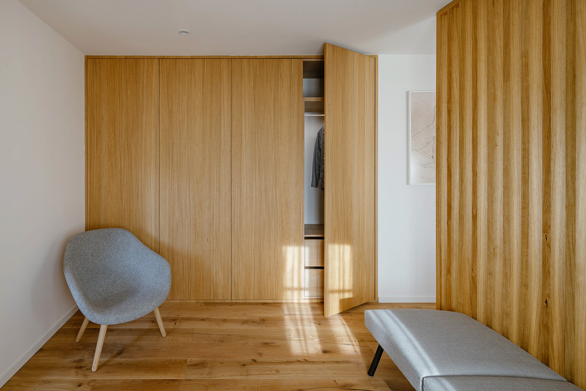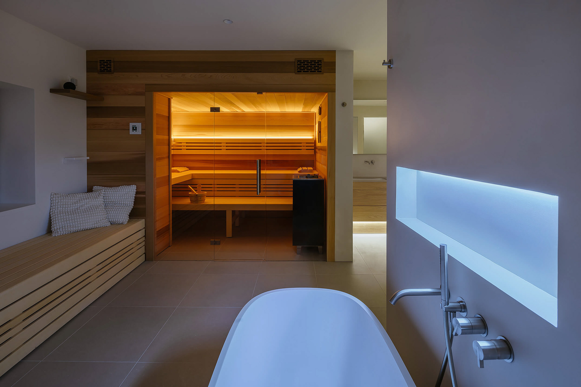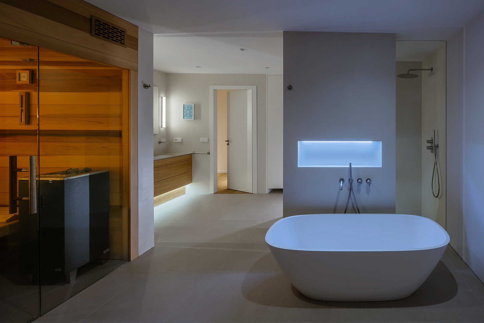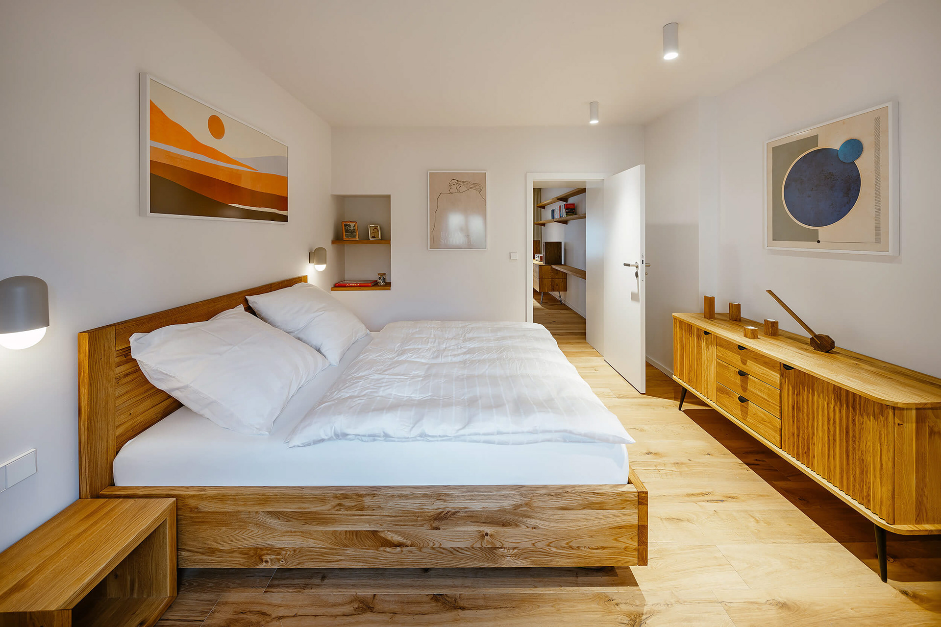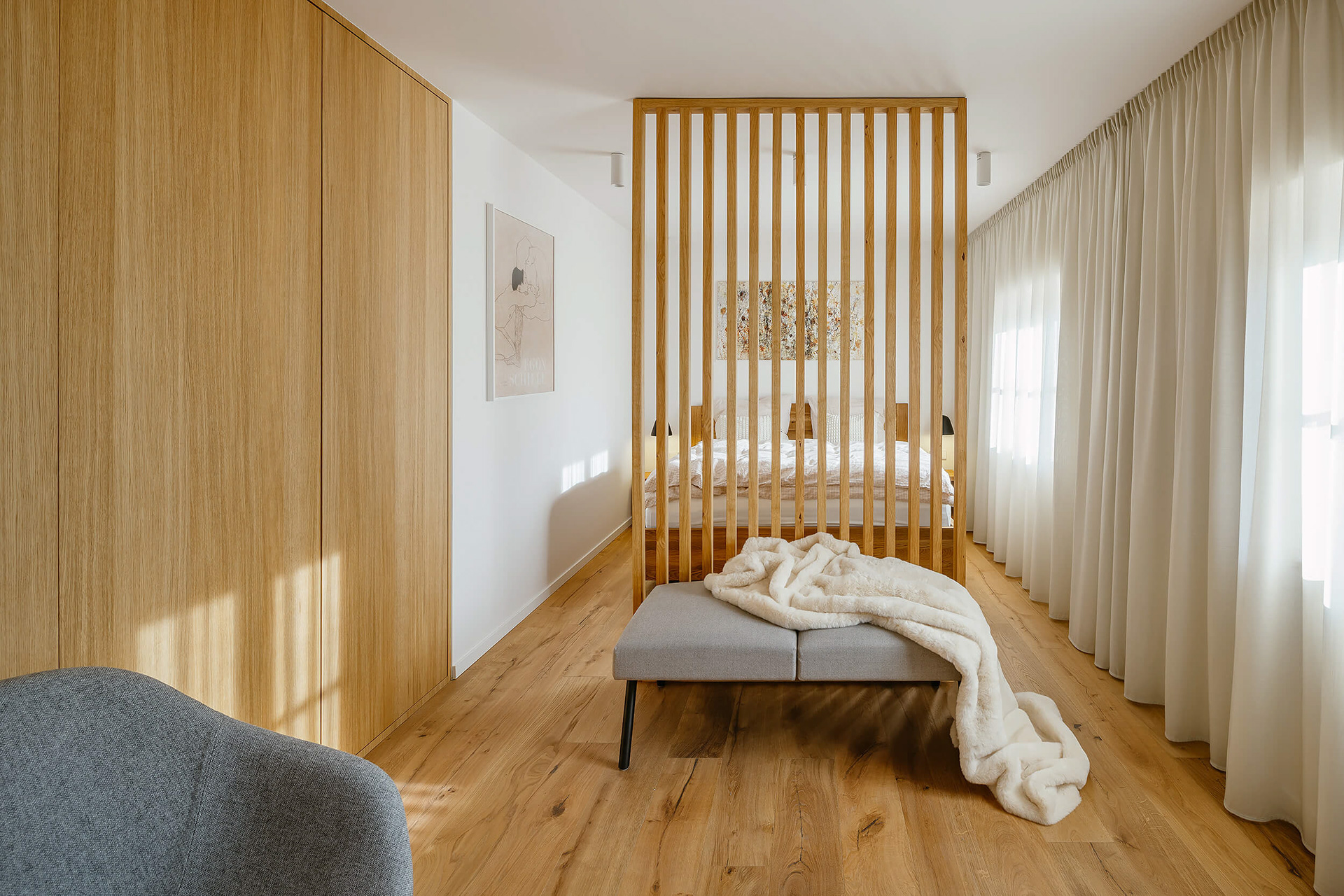 Prvně bylo nutné navrhnout novou dispozici odpovídající zadání, na původním místě zůstalo jen kamenné schodiště. Užitná plocha 220 m2 je poměrně velkorysá vzhledem k tomu, že se jedná jen o 4kk, tedy interiér, kde je kuchyňský kout součástí obytného prostoru a v prvním patře se nachází tři ložnice. Hlavní koupelna je rozšířena o prostorné wellness s infrasaunou, volně stojící vanou a odpočinkovou zónou. V domě jsou kromě dvou koupelen, wellness a technického zázemí ještě studijně relaxační prostory v hale a původní zimní zahrada, která navazuje na novou terasu z dubových prken a zbytek zahrady.
