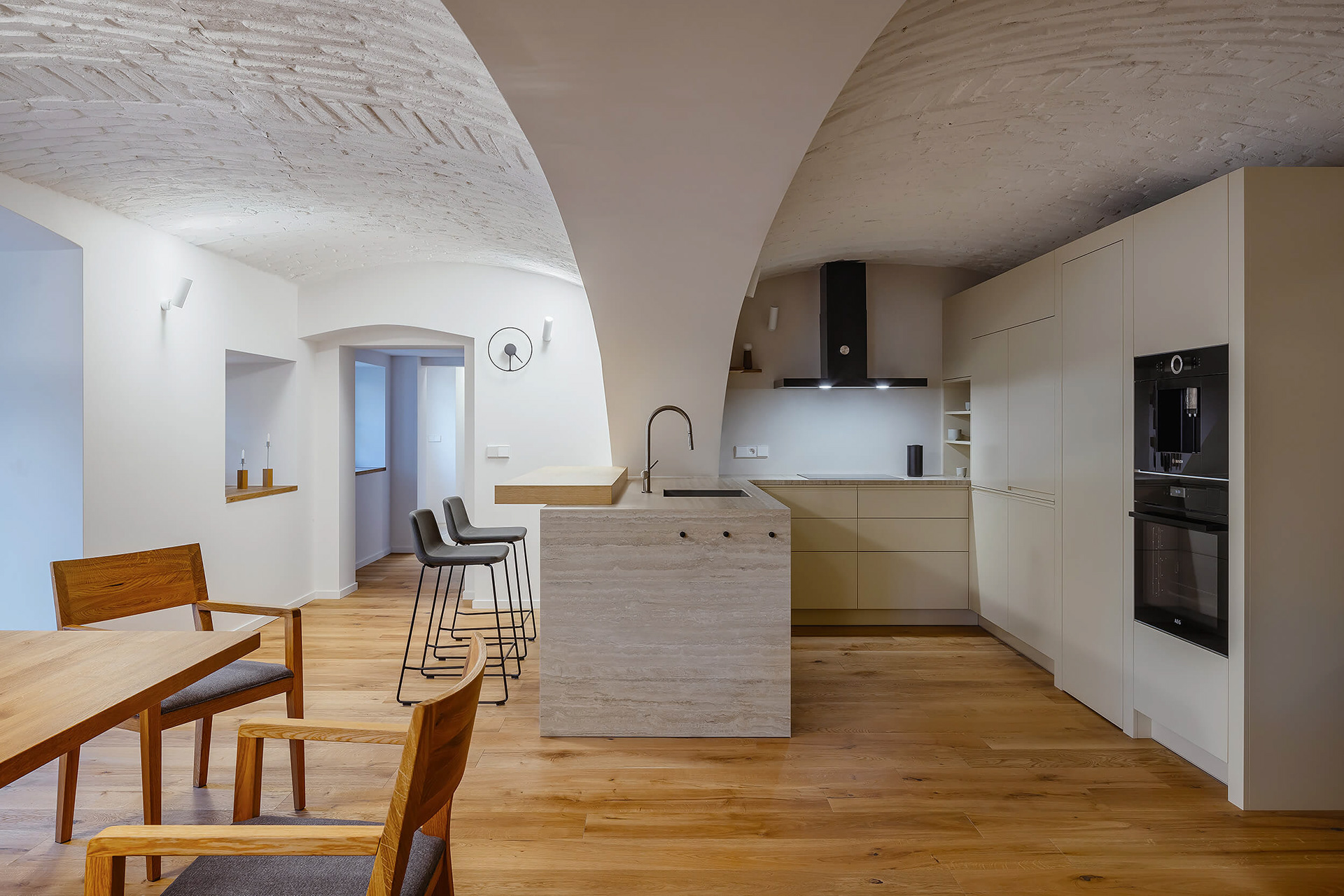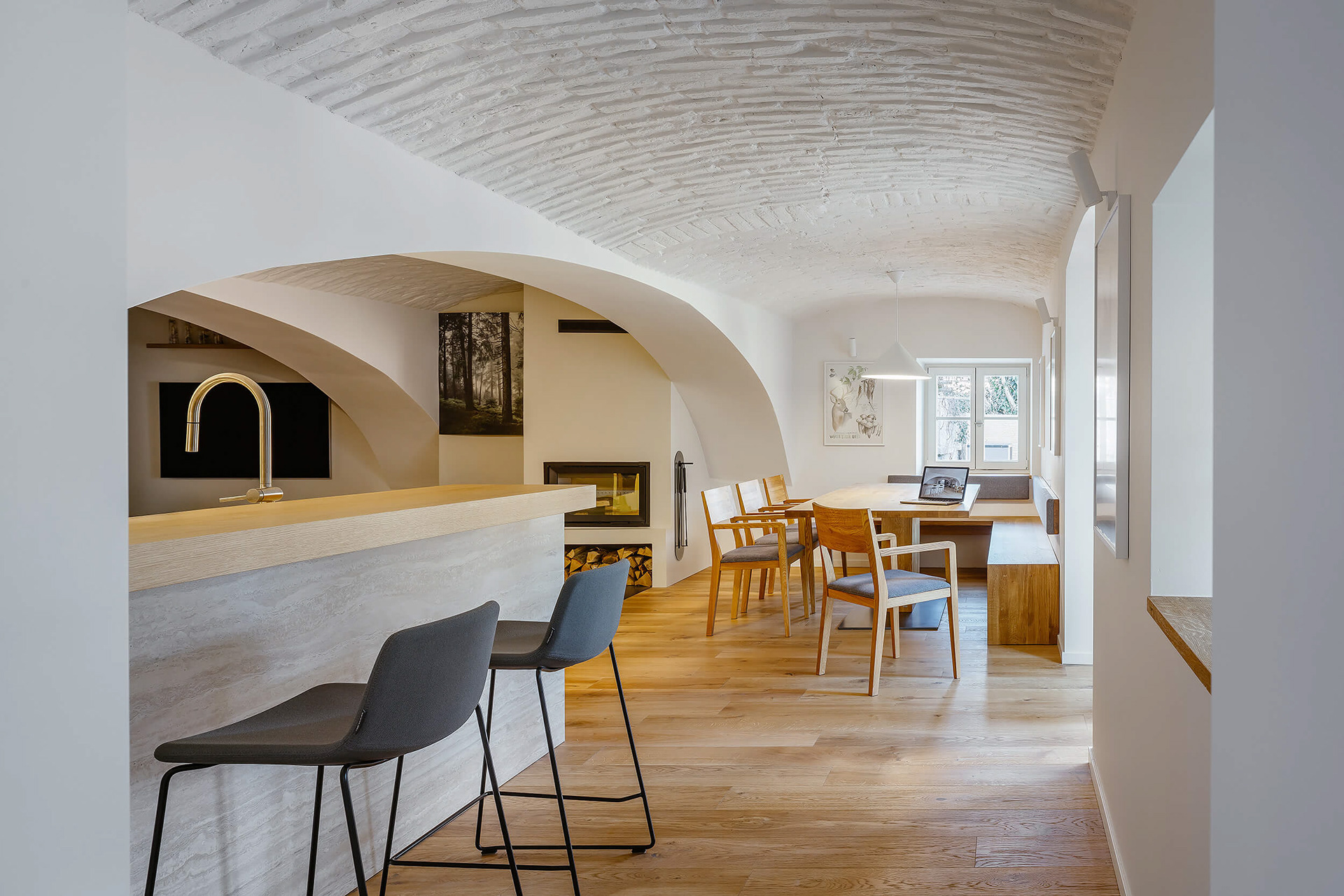 Během rekonstrukce byly pečlivě odhaleny struktury kamenných stěn a schodiště a rubů kleneb. Klenebné pasy vynášejí zaklenuté stropy nad hlavním obytným prostorem a výrazně jej tak definují nejen vizuálně ale i po uživatelské stránce, protože nová dispozice se musela s výškovým omezením při patách pasů vypořádat.