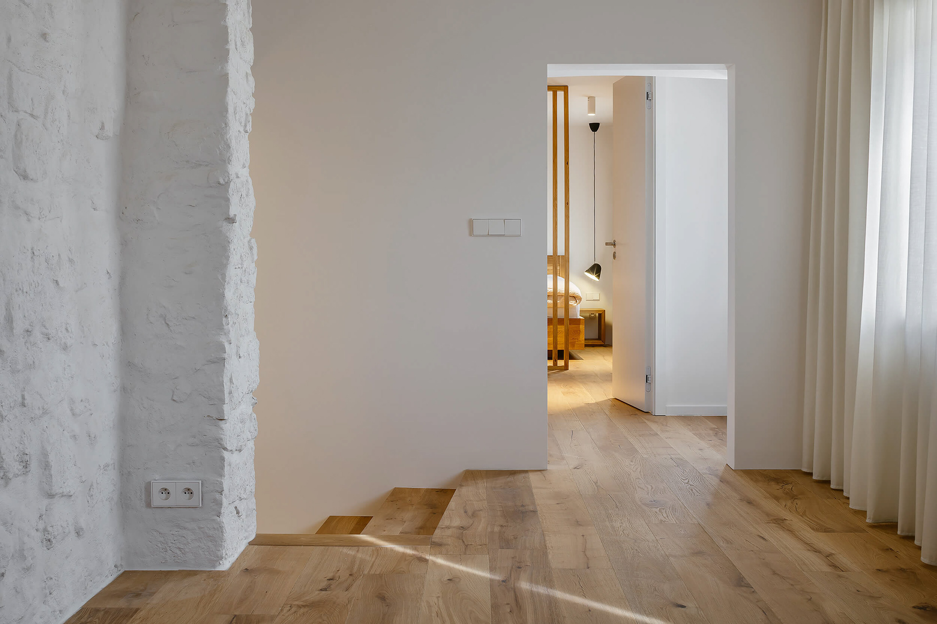 Použití ušlechtilých přírodních materiálů šlo ruku v ruce s estetickými požadavky klienta. Podlahy jsou kombinací kamenných, dřevěných a keramických materiálů. Stěny mají novou štukovou omítku nebo voděodolnou stěrku v případě koupelen a krbu. Část stěn a stropů má odhalené původní zdivo sjednocené společnou bílou výmalbou. Typový nábytek stejně tak jako vybavení na míru jsou z masivního dřeva stejné dřeviny stejně tak jako navazující dubové podlahy jak v interiéru tak na exteriérové terase. Sanitární vybavení i detaily a kování jsou provedeny v nerezu.